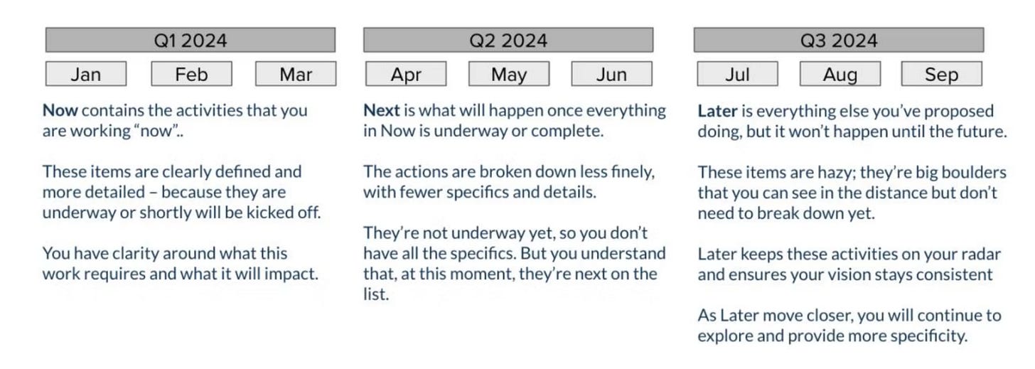 My tool of choice is the Now-Next-Later framework. Kudos to Janna Bastow (of Mind the Product and ProdPad) who invented it in 2022.